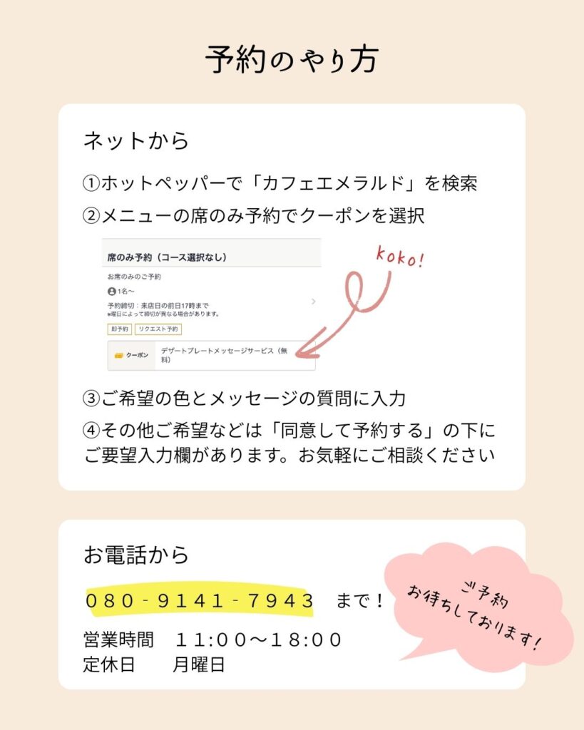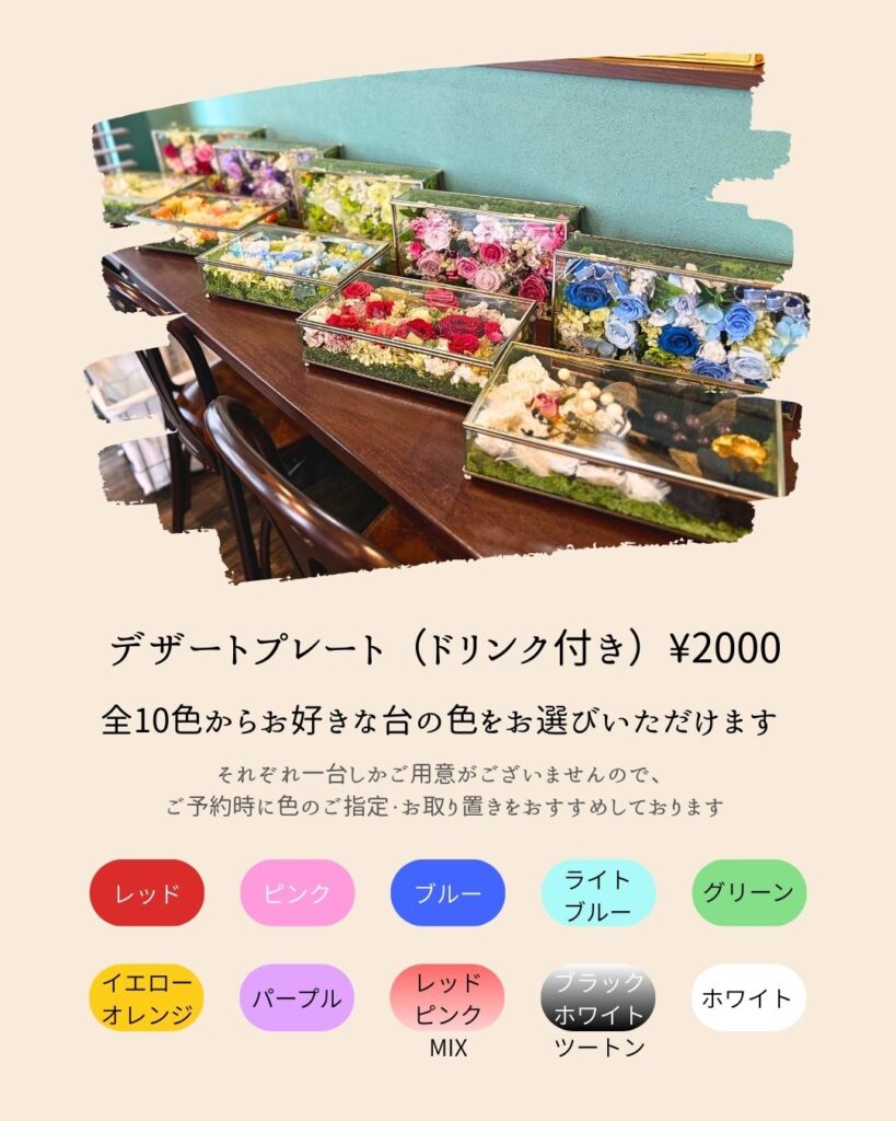 デザートプレートをお考えの方へ 2026.03.16 福岡で推し活できるカフェ、カフェエメラルドです!当店でご好評いただいているデザートプレートについて、選べる色や無料のメッセージサービス、ご予約方法などをまとめてみました! メッセージの内容やお席についてのご相談もお気軽になさってください。推し活や記念日、お客様の今日という日を少し特別な一日にできますよう、ぜひご予約お待ちしております。 一部料金改定のお知らせ 前の記事